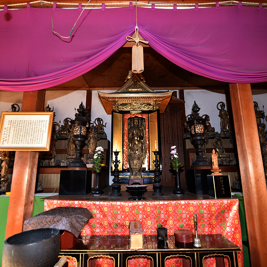 矢田観音は、代々、「秘仏」《お厨子(ずし)などに納められ、普段は拝観を許していない仏像。秘仏は開帳以外の時は厨子の扉を閉じたまま祀られている》とされており、年に一度、4月17日のみ御開帳されます。また、堂内には多くの「千手観音」も祀られています。どうしてこのようなお姿なのかといいますと、俗世で悩み苦しんでいる人々を救うためには二本の手では足りず、無数の手を自ら望まれたとされています。私たちを温かくしっかりと抱きとめる手、そのたなごごろにも眼を持っておられたり、また、私達の甘え心を打ち据える剣を持っておられるお姿もあります。